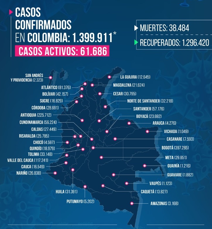 El reporte oficial del Ministerio de Salud acerca de las cifras del covid-19 para este jueves 10 de diciembre de 2020 da cuenta de que se detectaron 7.778 nuevos casos de covid-19 en toda Colombia y que realizaron 60.431 pruebas de detección, 36.866 tipo PCR y 23.565 de antígenos.