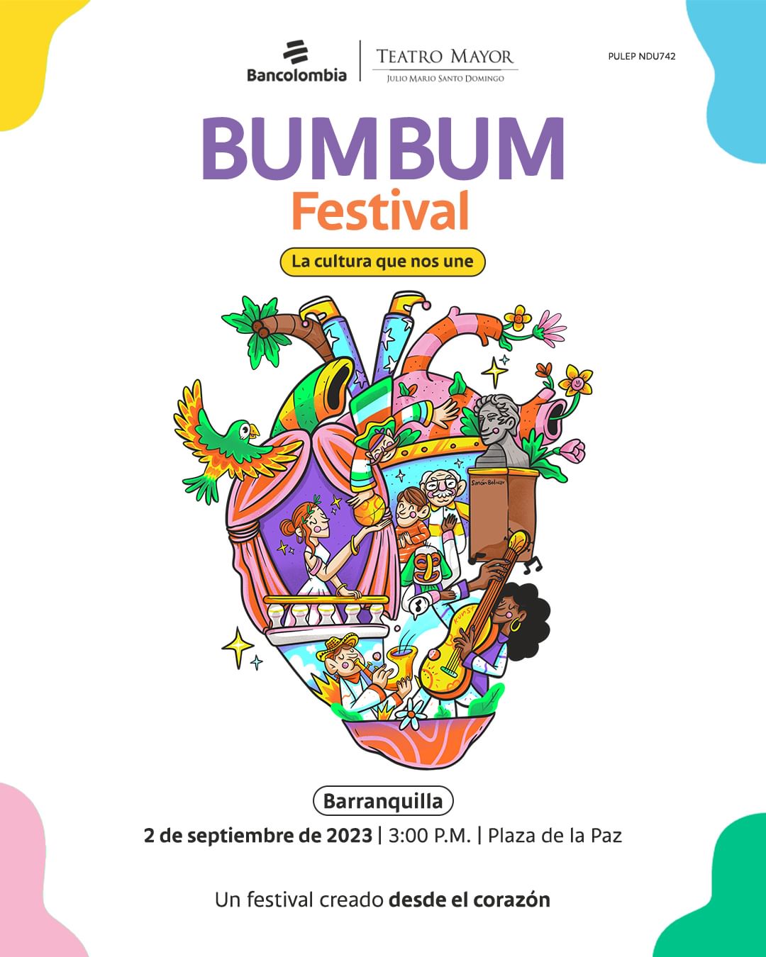 Este 2 de septiembre el maravilloso festival Bum Bum llegará a la plaza de la paz con una amplia gama de espectáculos, este evento se caracteriza por ser gratuito y abierto a todos los públicos, sin embargo, cuenta un aforo limitado de 5000 personas.