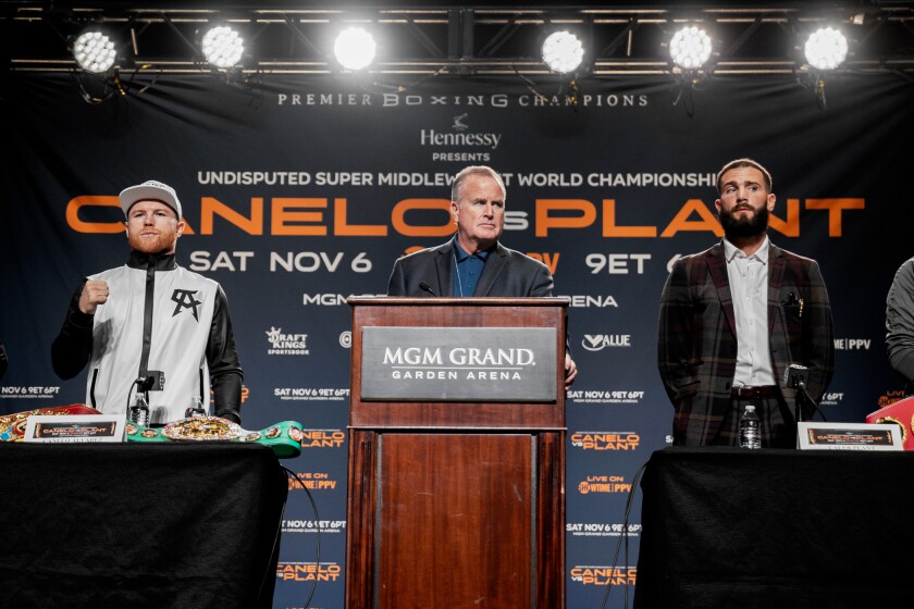 Canelo y Plant compartieron el escenario por primera vez el pasado miércoles desde su acalorada conferencia de prensa en septiembre, donde los dos luchadores intercambiaron empujones y golpes de mirada en Los Ángeles.