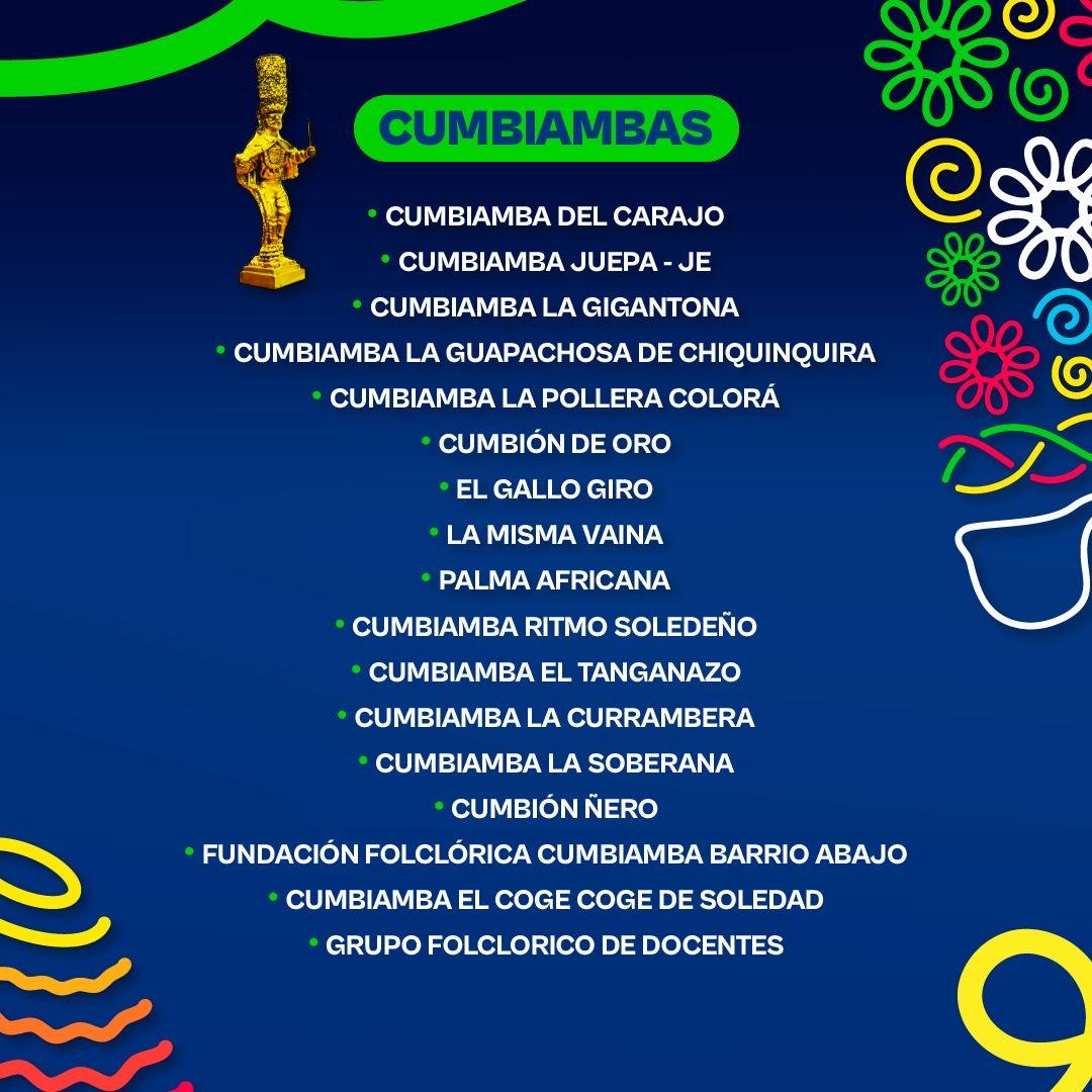 Dentro de los ganadores, se destacan 20 líderes de la tradición, 18 grupos de danzas, 30 comparsas, 5 comedias, 9 grupos de mapalé, 4 de son de negro, 17 de cumbias, 43 disfraces, 6 letanías, 6 expresiones invitadas al Carnaval, y 2 Joselito, entre otros. Cada uno de estos grupos y disfraces recibirá el reconocimiento más prestigioso de la fiesta, el Congo de Oro, en una ceremonia que se llevará a cabo el próximo mes.