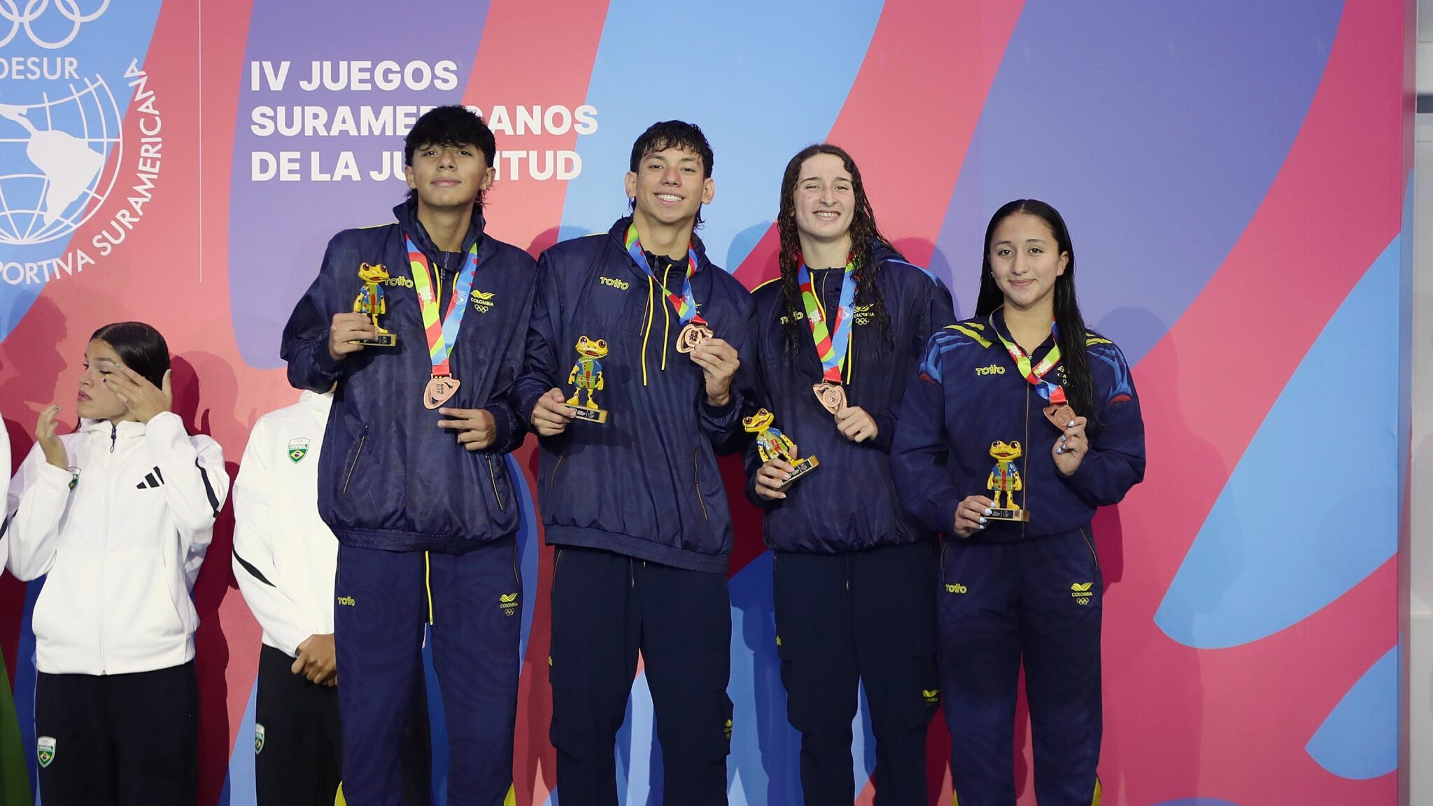 La tercera presea llegó en el relevo 4×100 metros combinado mixto, donde el equipo colombiano ocupó la tercera posición con un tiempo de 4:05.93, cerrando la jornada con presencia en el podio.