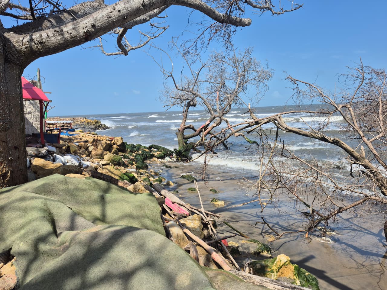 “La erosión costera, sumada al frente frío, ha provocado que el mar se meta y tumbe árboles y mesas; prácticamente no queda nada. Además, continúa socavando el terreno hasta acercarse a las viviendas”, expresó.
