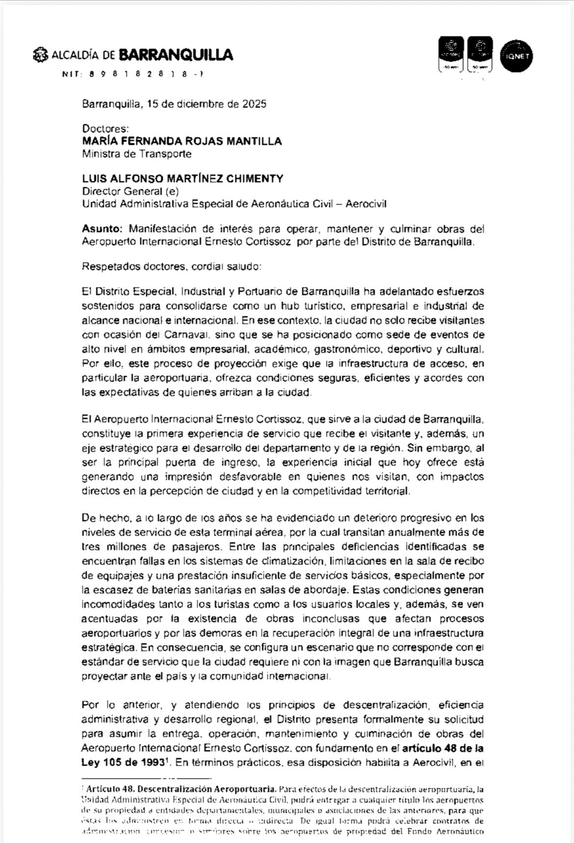 “El Distrito de Barranquilla manifiesta su interés y capacidad institucional, técnica, administrativa y financiera para asumir la operación y culminación de las obras del Aeropuerto Internacional Ernesto Cortissoz, con un enfoque de gestión orientado a resultados verificables. El propósito es concreto: mejorar niveles de servicio al usuario, asegurar el mantenimiento oportuno de la infraestructura complementaria y cerrar brechas operativas derivadas de obras inconclusas, bajo estándares exigibles y coordinados con la autoridad aeronáutica, garantizando el cumplimiento de la normativa aplicable”, se leía en la carta.
