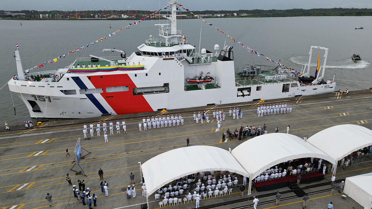 Destacó que la construcción de esta embarcación es una muestra de cómo “la Fuerza Pública de Colombia puede ser base en la construcción de la industria nacional, en todas las armas y en todas las posibilidades. Así que este es un primer hecho. Ahí hay un buque que zarpa, hecho en Colombia, entonces habrá una fragata que ya en este momento se está construyendo”.