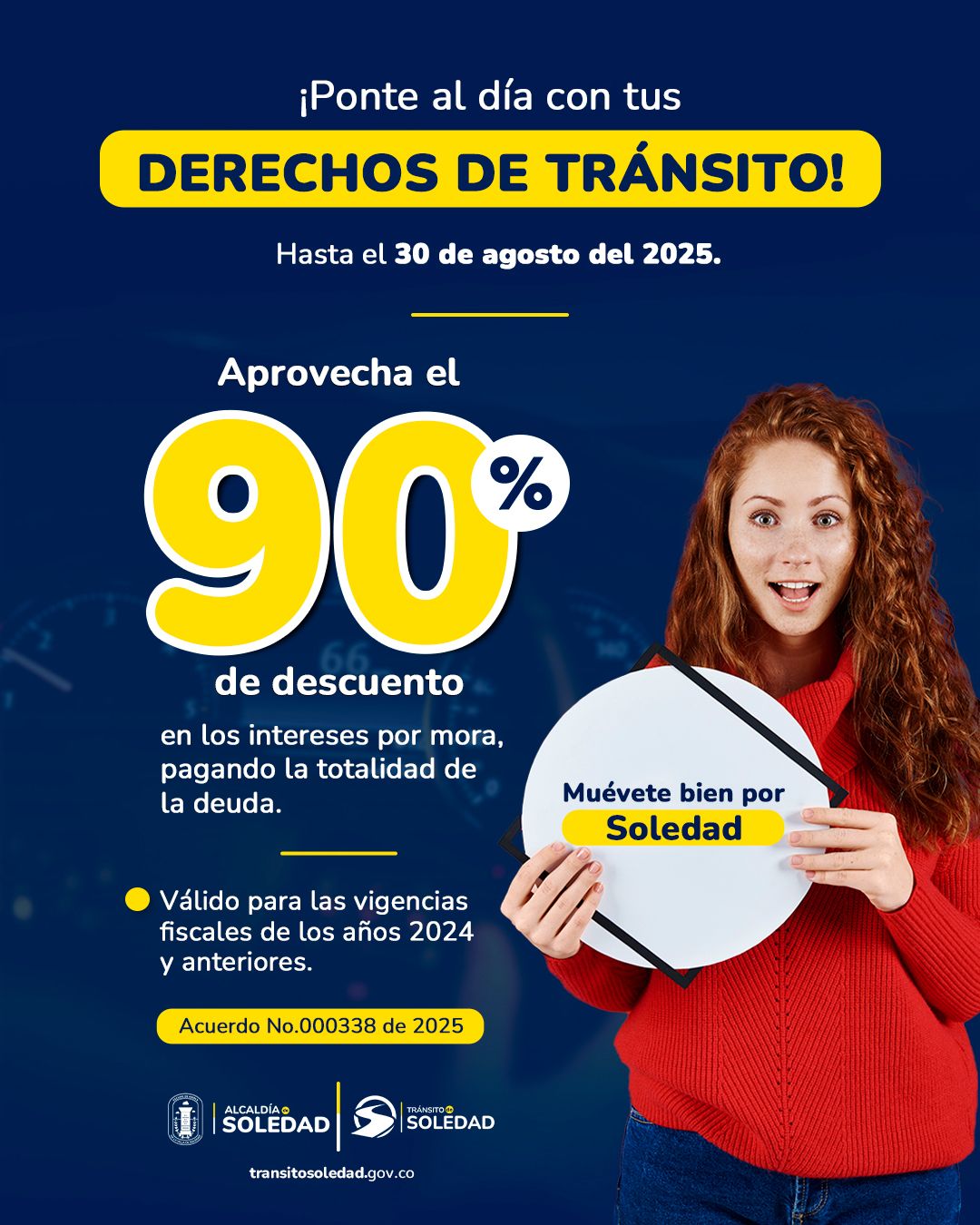 Actuando en conformidad con el Acuerdo Municipal 000338 de 2025, el Instituto de Tránsito y Transportes de Soledad otorgará a los ciudadanos beneficios tributarios en los intereses por mora en derechos de tránsito, a quienes cancelen la totalidad de la deuda.