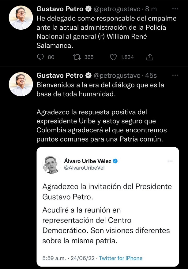 Esta mañana, Álvaro Uribe agradeció, vía twitter “…la invitación del Presidente Gustavo Petro. Acudiré a la reunión en representación del Centro Democrático. Son visiones diferentes sobre la misma patria”, a lo que Petro respondió dándole la bienvenida a la “era del diálogo, que es la base de toda humanidad”, y agregó que “estoy seguro de que Colombia agradecerá el que encontremos puntos comunes para una patria común”.