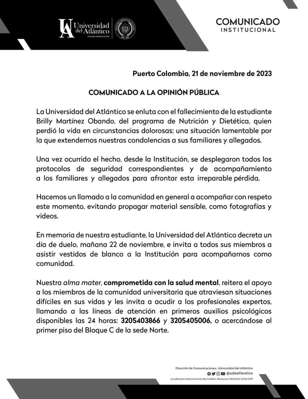 Por estos hechos se pronunció Danilo Hernández, rector de UniAtlantico, lamentando los hechos y extendió un abrazo a los familiares.