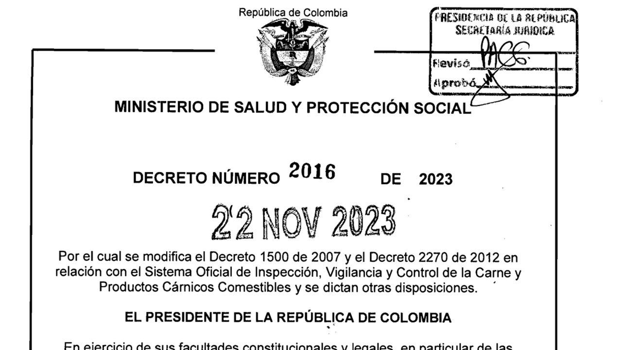 El Ministerio de Salud y Protección Social expidió el Decreto 2016 de 2023 que reglamenta el funcionamiento de las plantas de beneficio animal o mataderos municipales, en la categoría de autoconsumo, los cuales deberán tener viabilidad del Invima para abastecer de carne a los consumidores.
