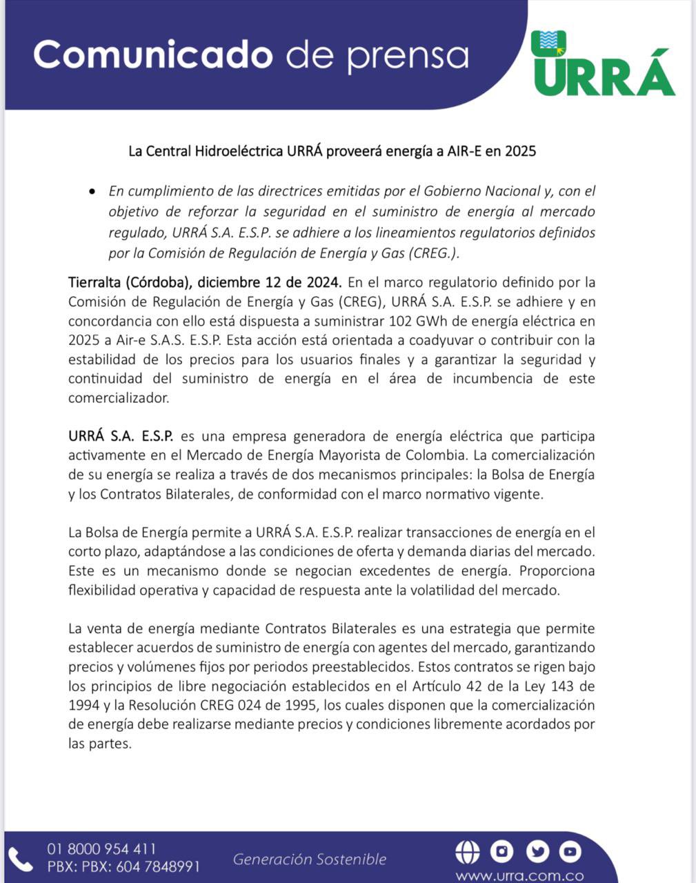 “Urrá S.A. E.S.P. es una empresa generadora de energía eléctrica que participa activamente en el Mercado de Energía Mayorista de Colombia. La comercialización de su energía se realiza a través de dos mecanismos principales: la bolsa de energía y los contratos bilaterales, de conformidad con el marco normativo vigente. La venta de energía mediante contratos bilaterales es una estrategia que permite establecer acuerdos de suministro de energía con agentes del mercado, garantizando precios y volúmenes fijos por períodos preestablecidos” mencionaba el comunicado.