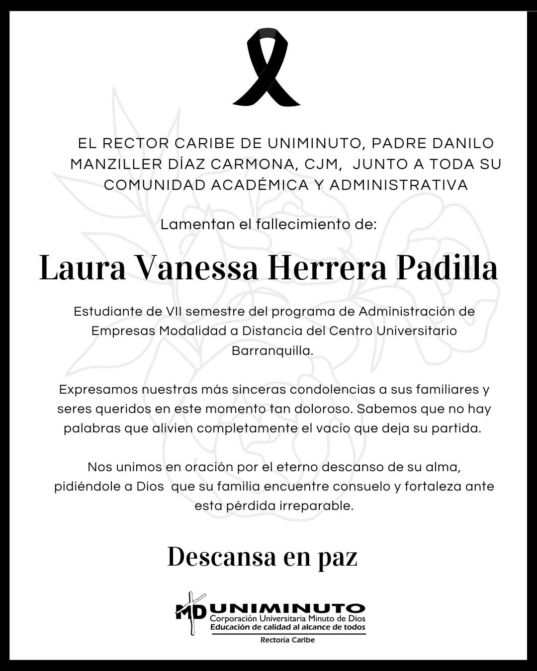 “La Rectoría Caribe de UNIMINUTO, en cabeza del padre Danilo Manziller Díaz Carmona, CJM, y toda su comunidad académica y administrativa, lamenta profundamente el fallecimiento de Laura Vanessa Herrera Padilla, estudiante de séptimo semestre del programa de Administración de Empresas, en modalidad a distancia, del Centro Universitario Barranquilla”.