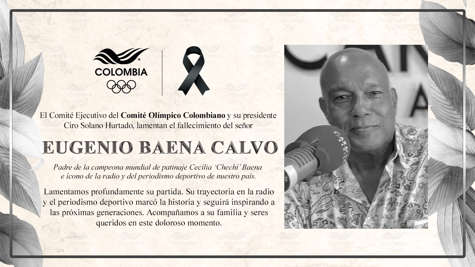 El comité ejecutivo del Comité Olímpico Colombiano en cabeza de su presidente, Ciro Solano Hurtado, lamenta profundamente el fallecimiento del reconocido periodista deportivo Eugenio Baena Calvo, padre de la múltiple campeona mundial de patinaje, Cecilia Baena, y envía un mensaje de condolencias a sus seres queridos durante estos difíciles momentos.