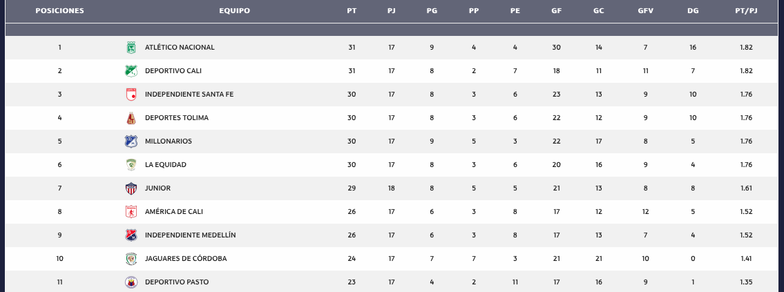 Medellín: 9º con 26 puntos,  tiene que ganar por cuatro o más goles para quedar por encima de Junior.