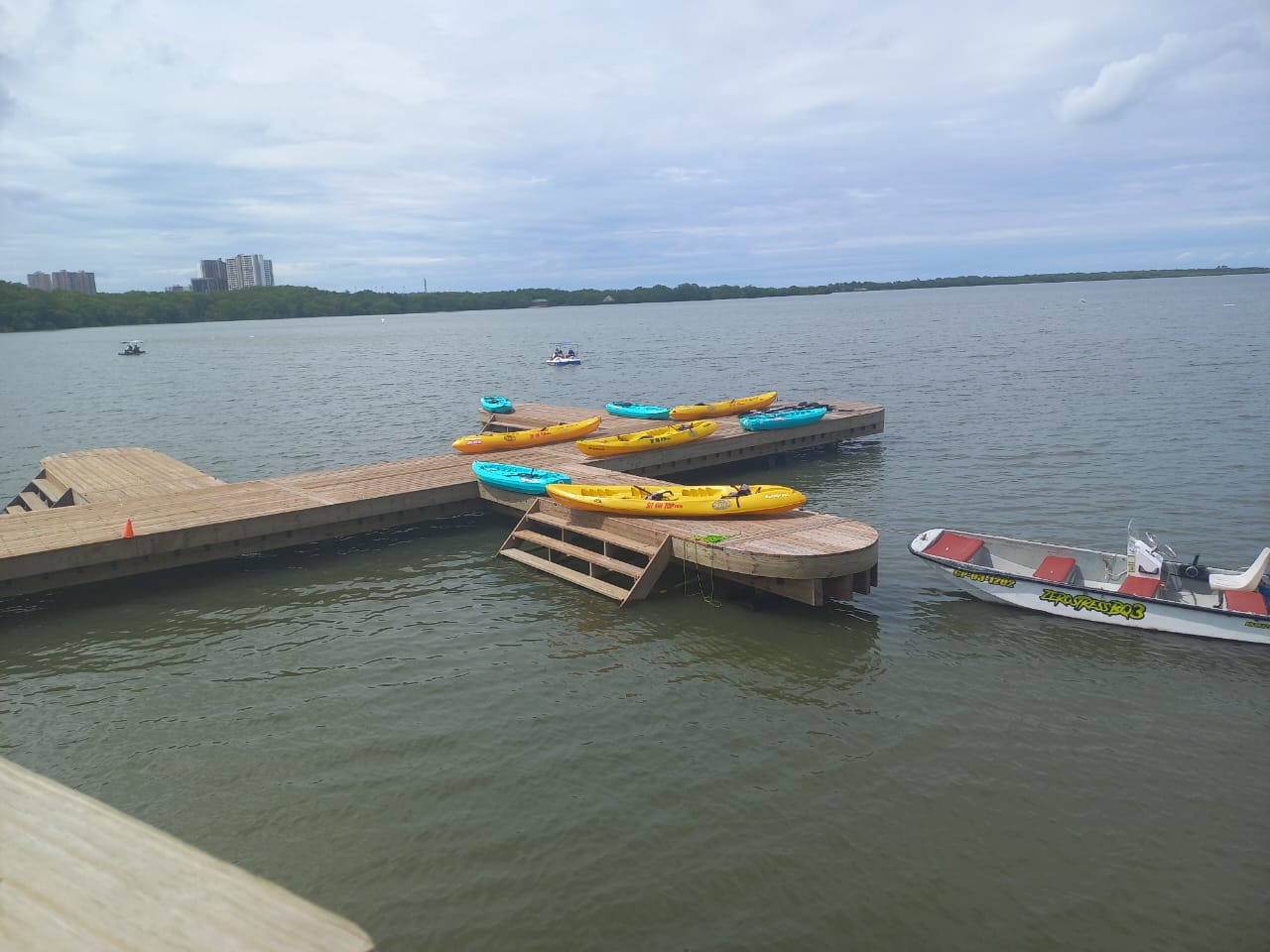 Otras de las atracciones que tiene el Ecoparque es la zona del muelle en la que se realizan los deportes náuticos, como los Cayas, las bicicletas marinas, las lanchas ecológicas que funcionan electrónicamente, están prohibidas las motos acuáticas por ser contaminantes.