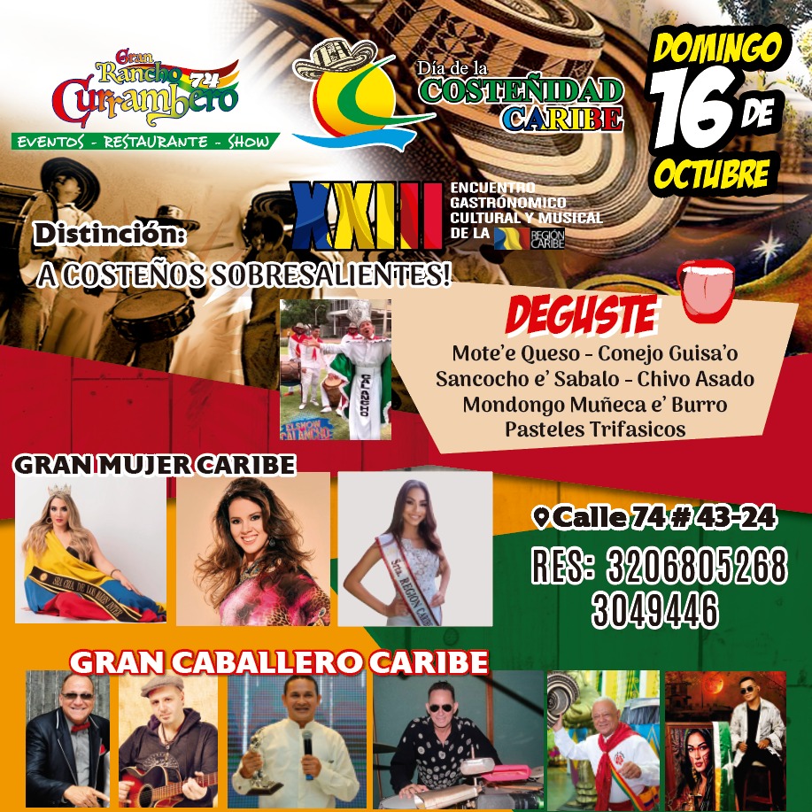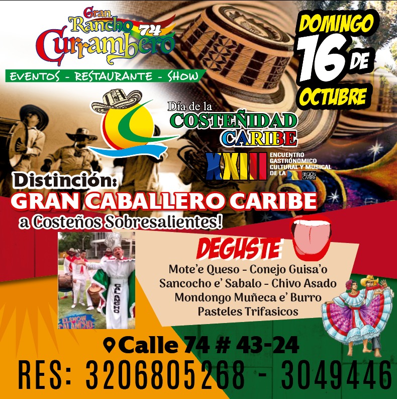 Los olores y los sabores gastronómicos de la Región Caribe y sus Sonidos Musicales estarán presentes este domingo 16 de octubre a partir de las 6:00 de la tarde en el Gran Rancho Currambero ubicado en la Calle 74 No 43 – 24.