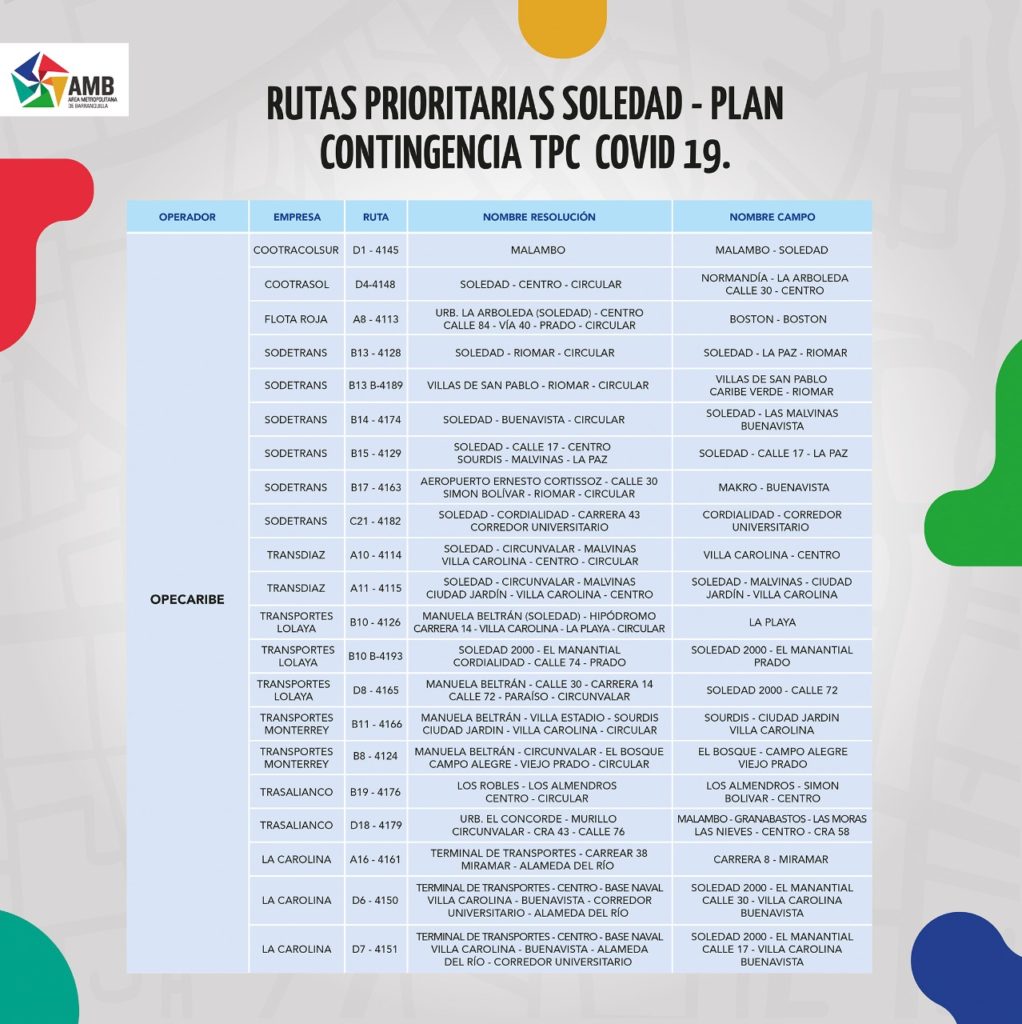 Ante la suspensión de las operaciones del Sistema Transmetro el Área Metropolitana de Barranquilla, anunció que pueden con las rutas habilitadas del transporte público colectivo, atender la demanda de usuarios para desplazarlos entre Barranquilla y Soledad.