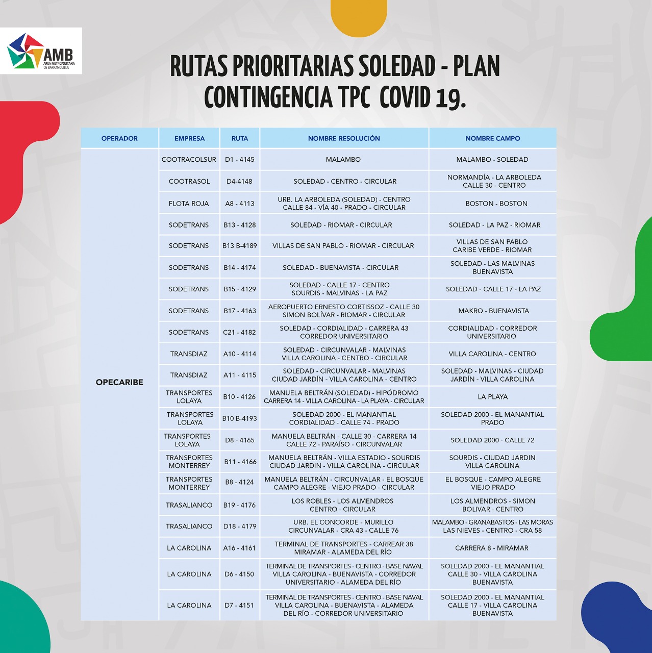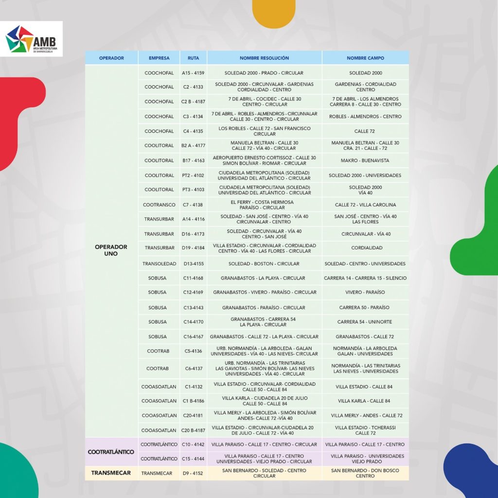 Según el director del AMB, Libardo García Guerrero, en total son 49 rutas que cubrirán los destinos entre Soledad y Barranquilla, y viceversa, especialmente a los barrios aledaños a la troncal de Transmetro de ese municipio, las cuales deben utilizarse con prudencia.