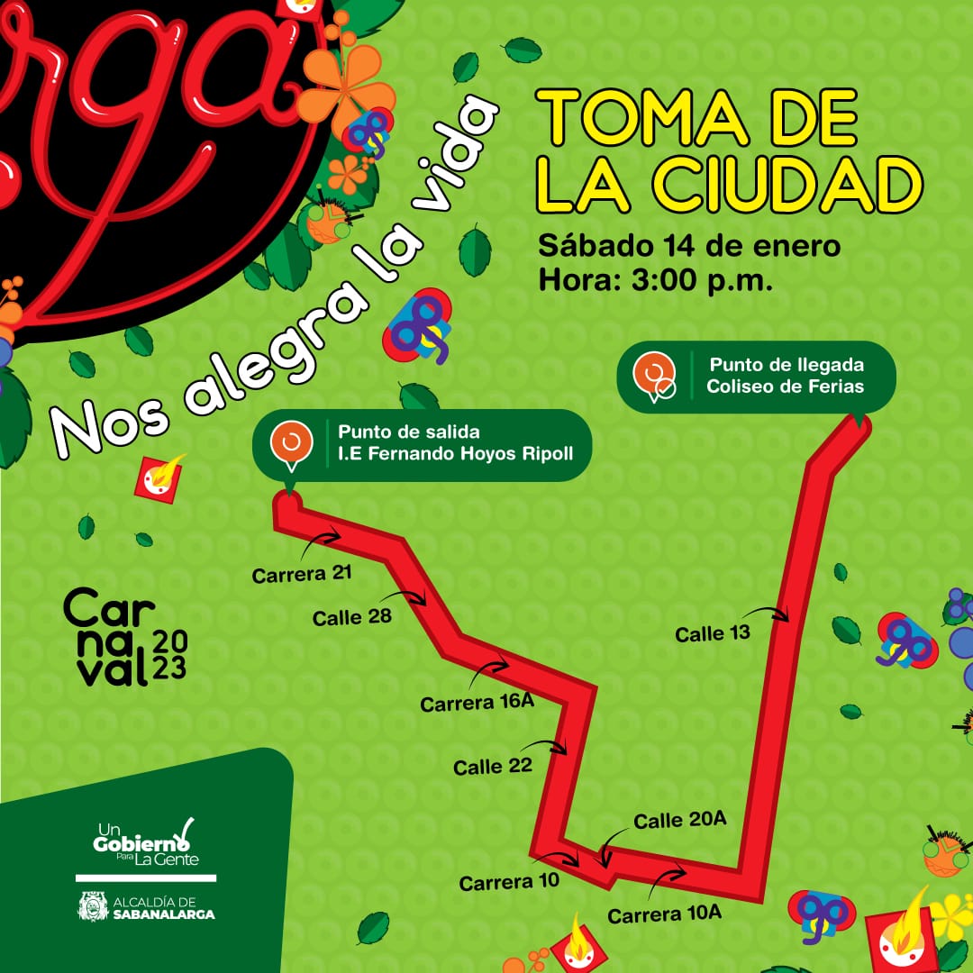 “La Toma de la Ciudad es un abrebocas a toda la temporada de Carnaval, consiste en una caravana con la reina Laudith Jimenez Peña, se estará desarrollando desde las 3 de la tarde, tomando como punto de partida, la institución educativa Fernndo Hoyos, cerca a la Cordialidad, y tiene un recorrido bastante amplio por las diferentes calles”, explicó Ávila.