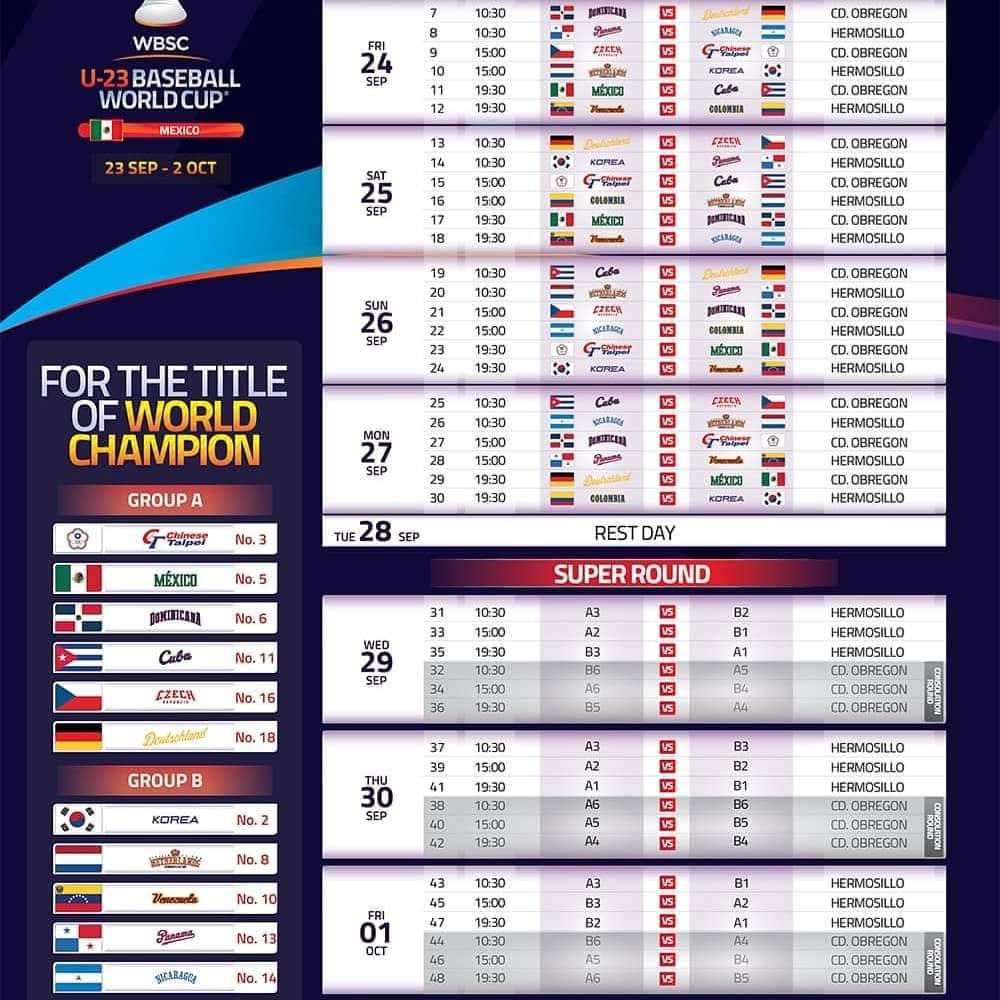 China Taipei, República Dominicana, Cuba, República Checa, Alemania y México, fueron sembrados en el Grupo “A” que tendrá como sede la Ciudad de Obregón.