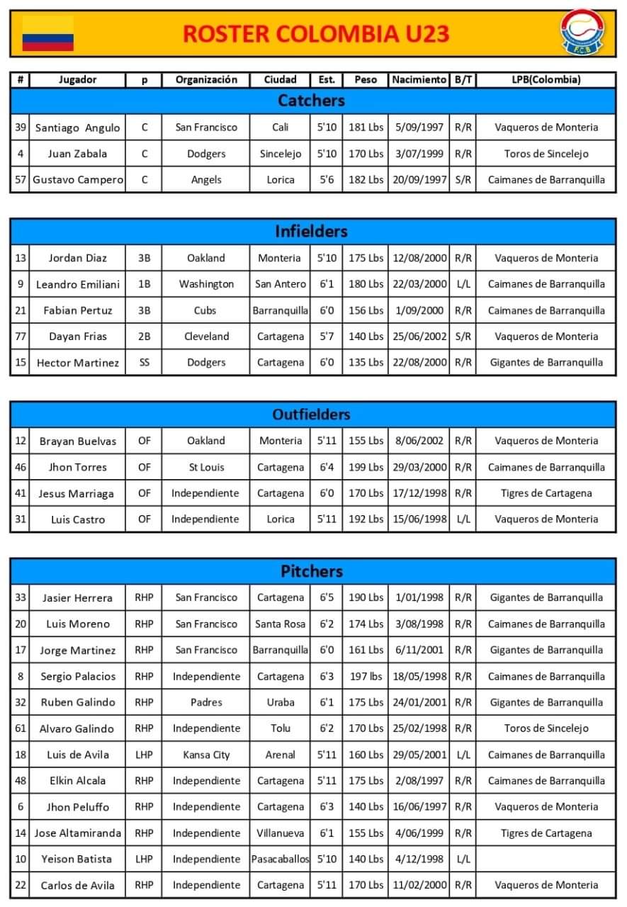 La Federación Colombiana de Béisbol (FCB) y el cuerpo técnico escogieron a los mejores jugadores disponibles menores de 23 años para encarar la participación en el evento organizado por la Confederación Mundial de Béisbol y Softbol (WBSC).