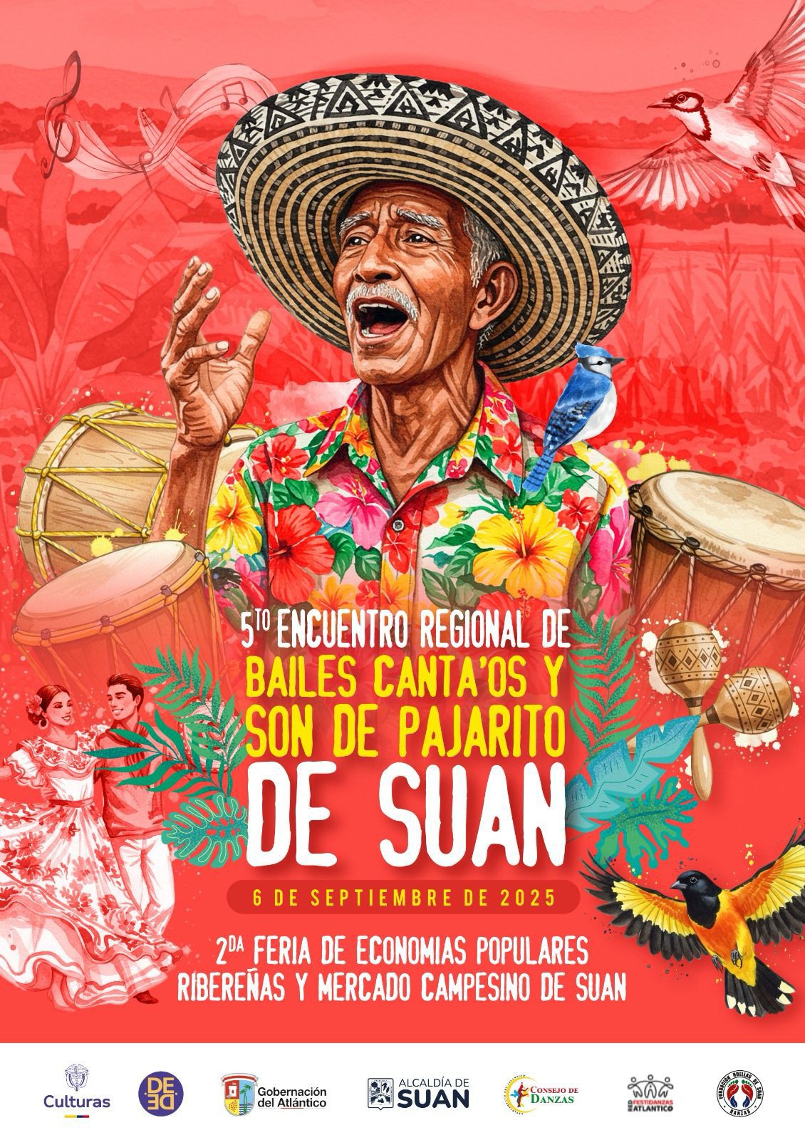 El cierre, a las 10:00 p. m., será una verdadera celebración colectiva con la Rueda de Bailes Canta’os, donde el público, ataviado con polleras y sombreros, se unirá al compás de versos y tambores para bailar bullerengue, tambora, chandé, son de negro y, por supuesto, el emblemático Son de Pajarito en una noche que promete hacer vibrar el alma de Suan y de todo el Atlántico.